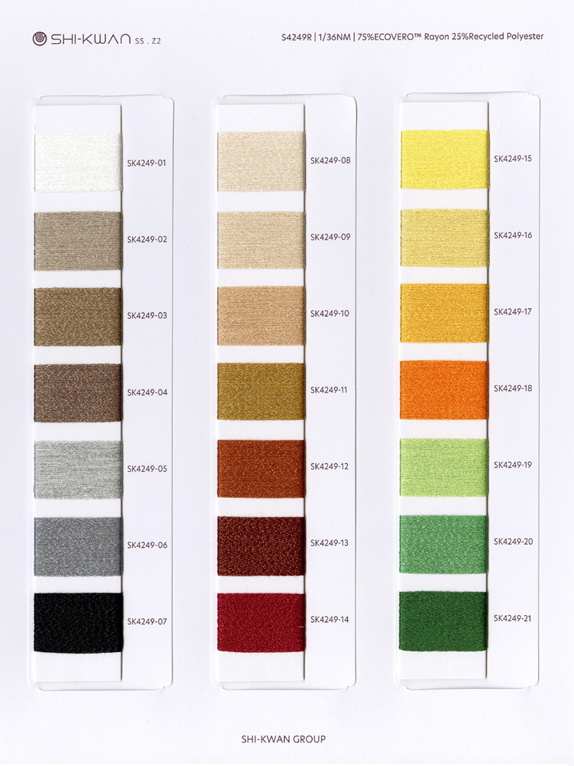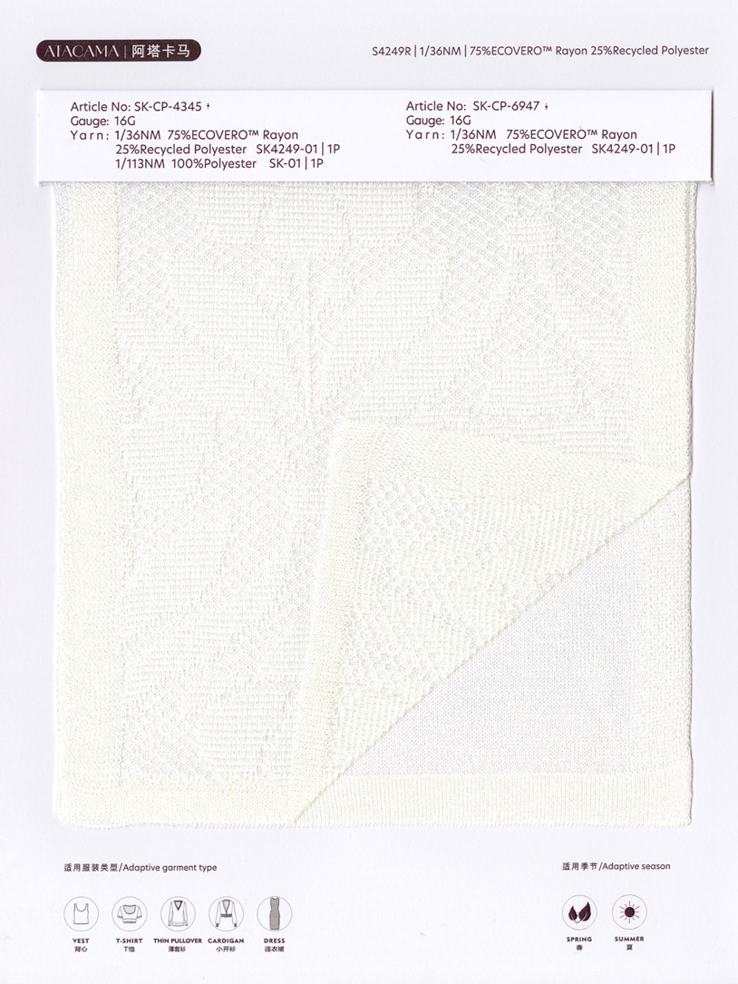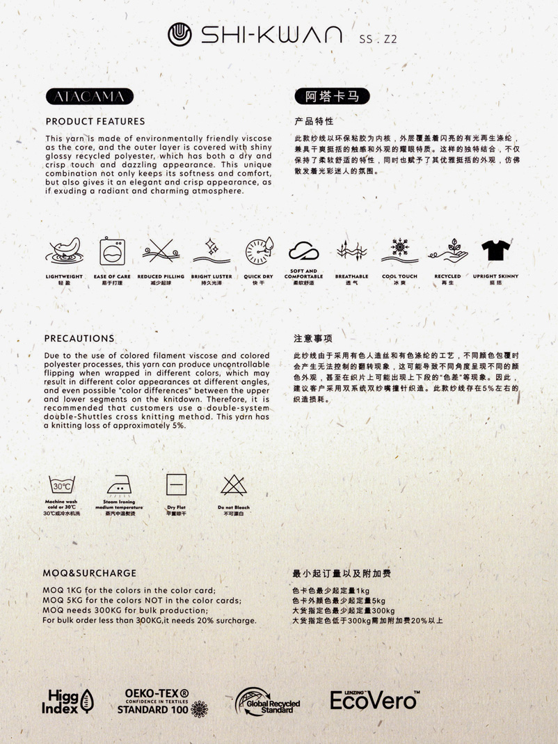 This yarn is made of environmentally friendly viscose as the core, and the outer layer is covered with shiny glossy recycled polyester, which has both a dry and crisp touch and dazzling appearance. This unique combination not only keeps its softness and comfort, but also gives it an elegant and crisp appearance, as if exuding a radiant and charming atmosphere.