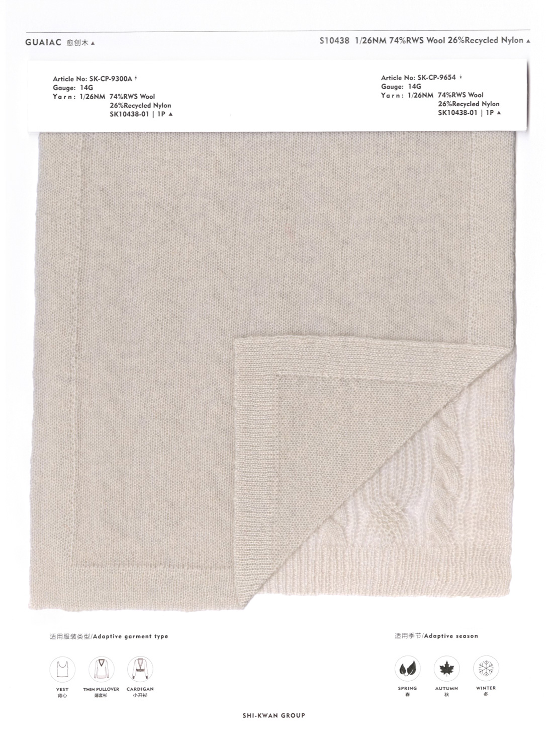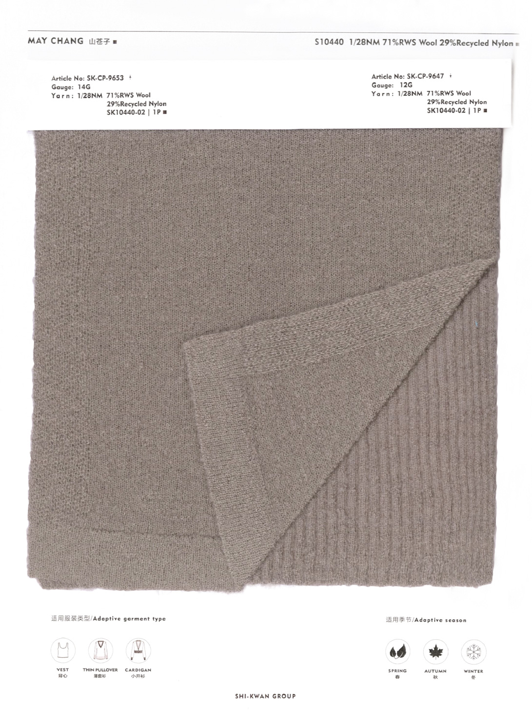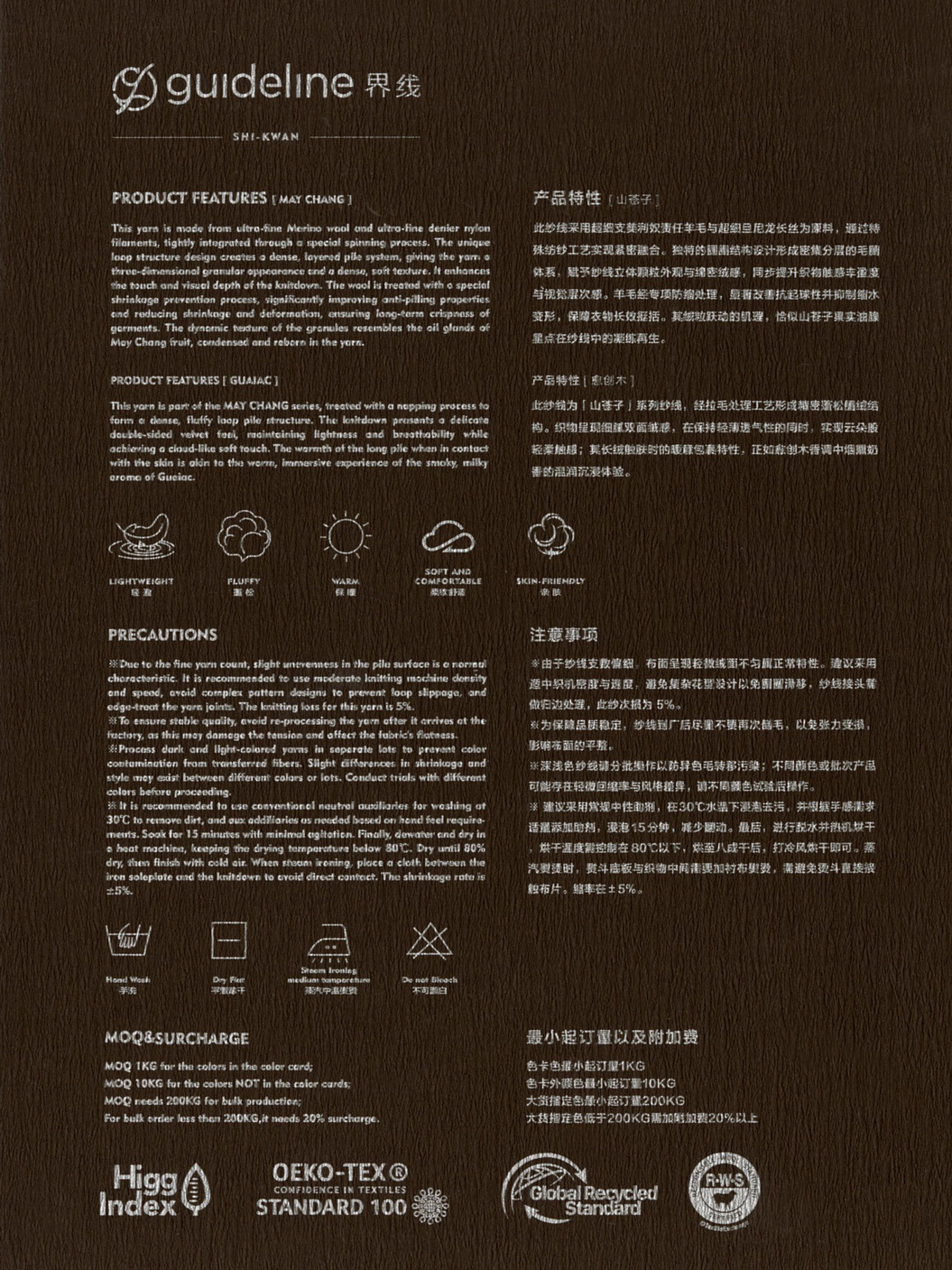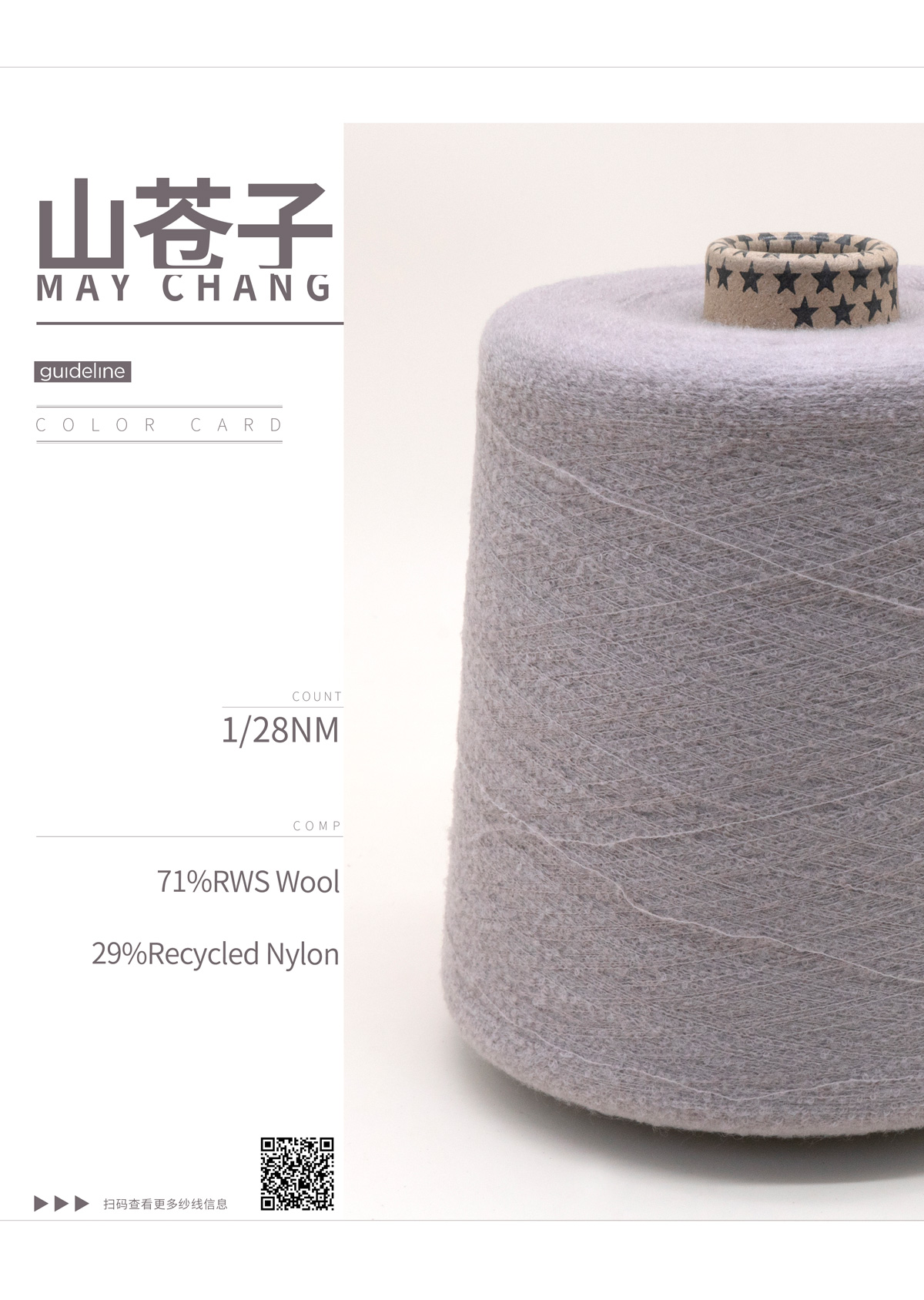This yarn is made from ultra-fine Merino wool and ultra-fine denier nylon filaments, tightly integrated through a special spinning process. The unique loop structure design creates a dense, layered pile system, giving the yarn a three-dimensional granular appearance and a dense, soft texture. It enhances the touch and visual depth of the knitdown. The wool is treated with a special shrinkage prevention process, significantly improving anti-pilling properties and reducing shrinkage and deformation, ensuring long-term crispness of garments. The dynamic texture of the granules resembles the oil glands of May Chang fruit, condensed and reborn in the yarn.