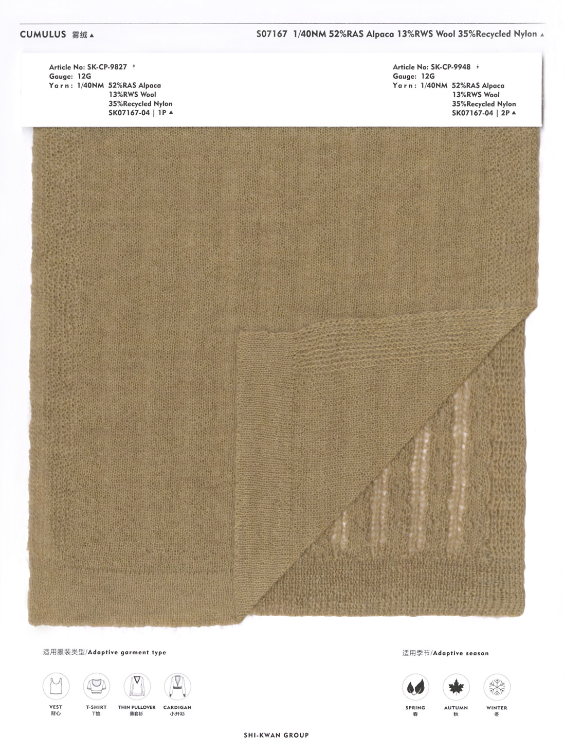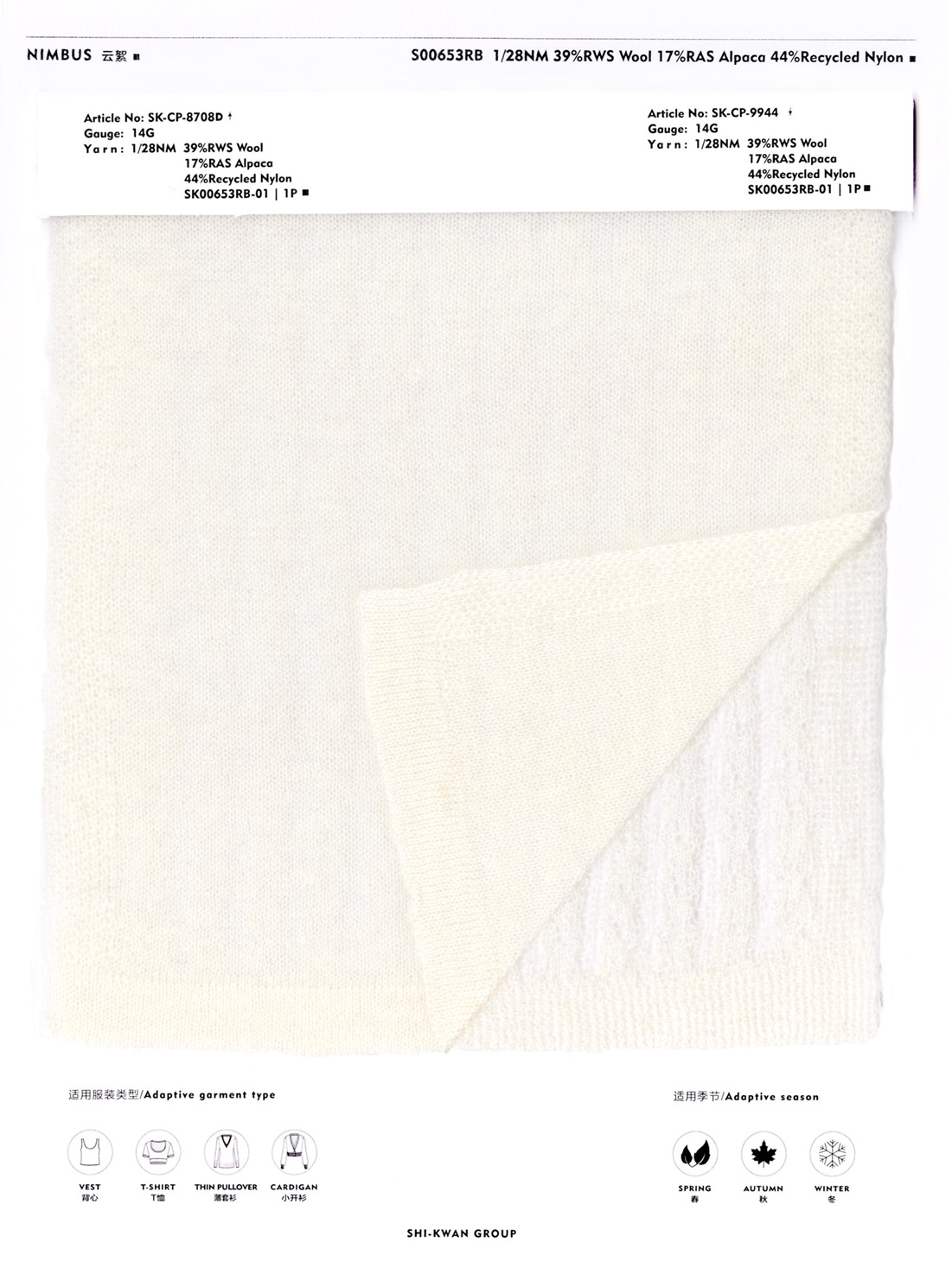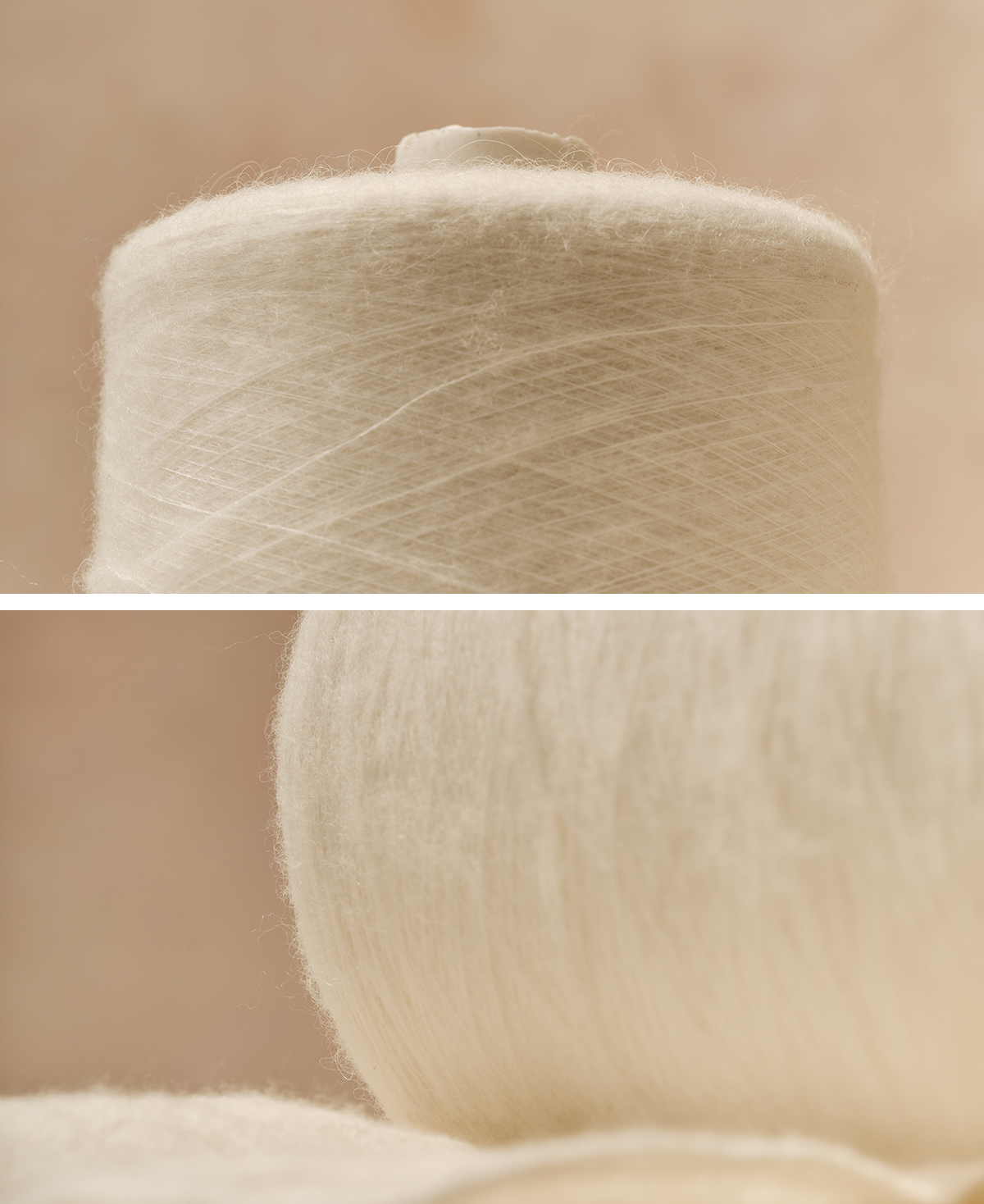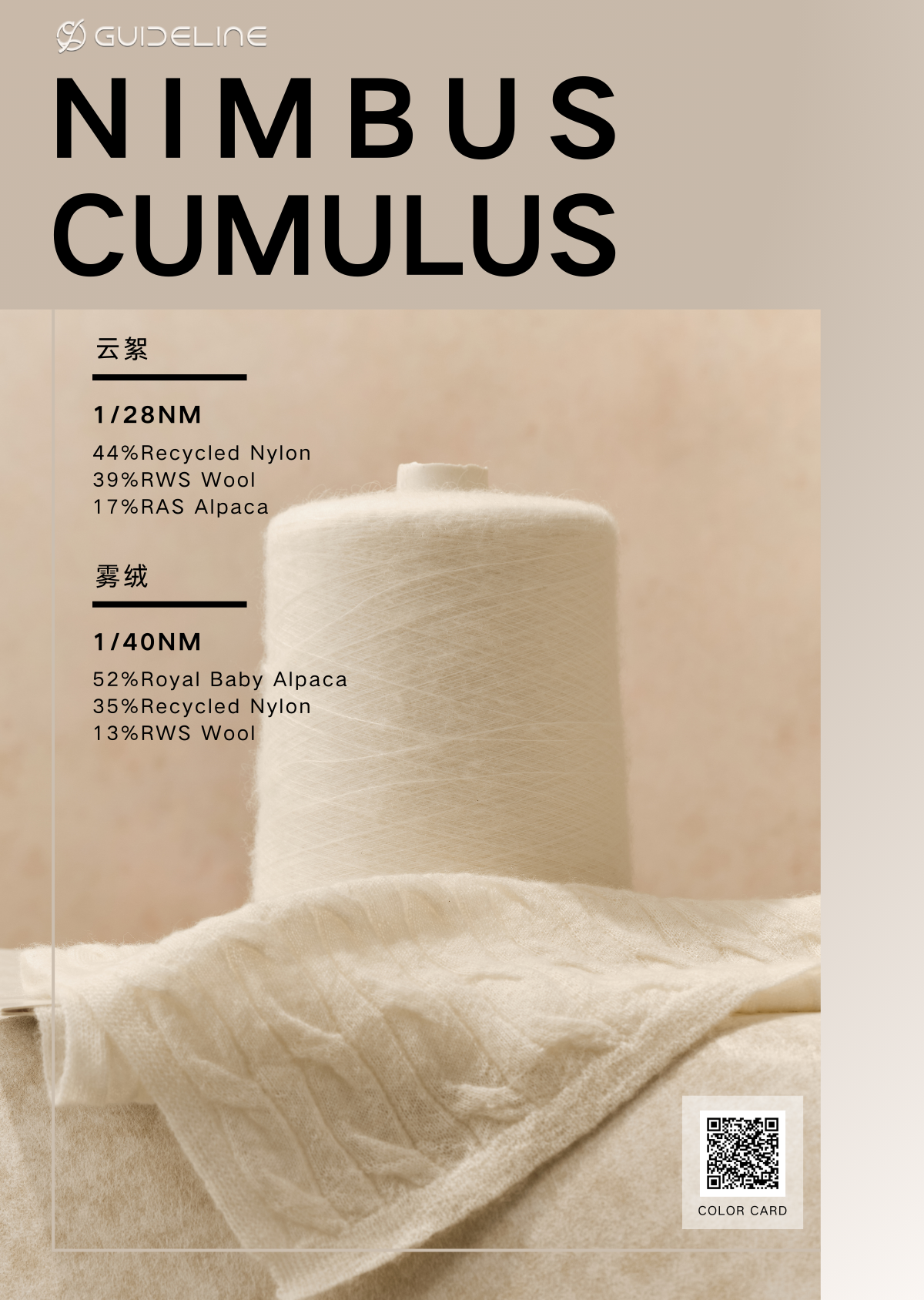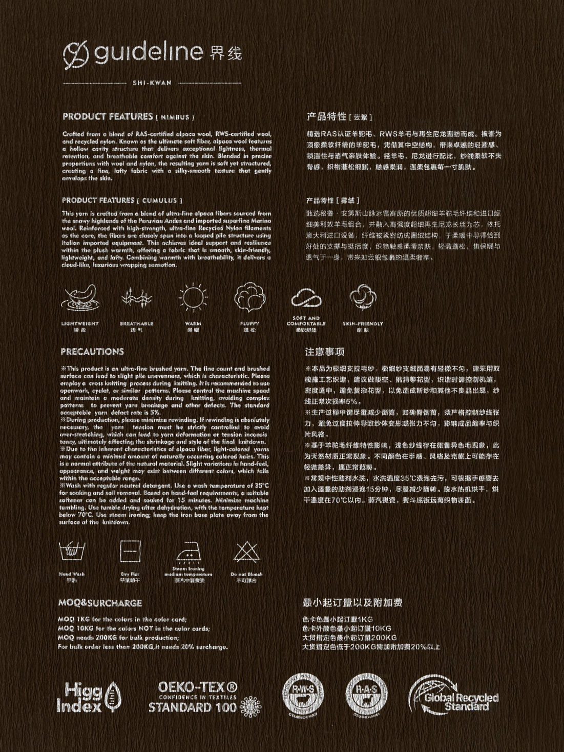 Crafted from a blend of RAS-certified alpaca wool, RWS-certified wool, and recycled nylon. Known as the ultimate soft fiber, alpaca wool features a hollow cavity structure that delivers exceptional lightness, thermal retention, and breathable comfort against the skin. Blended in precise proportions with wool and nylon, the resulting yarn is soft yet structured, creating a fine, lofty fabric with a silky-smooth texture that gently envelops the skin.