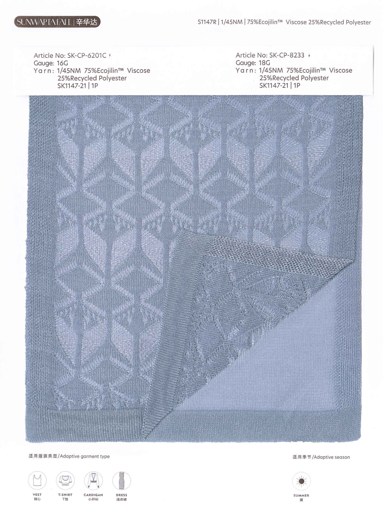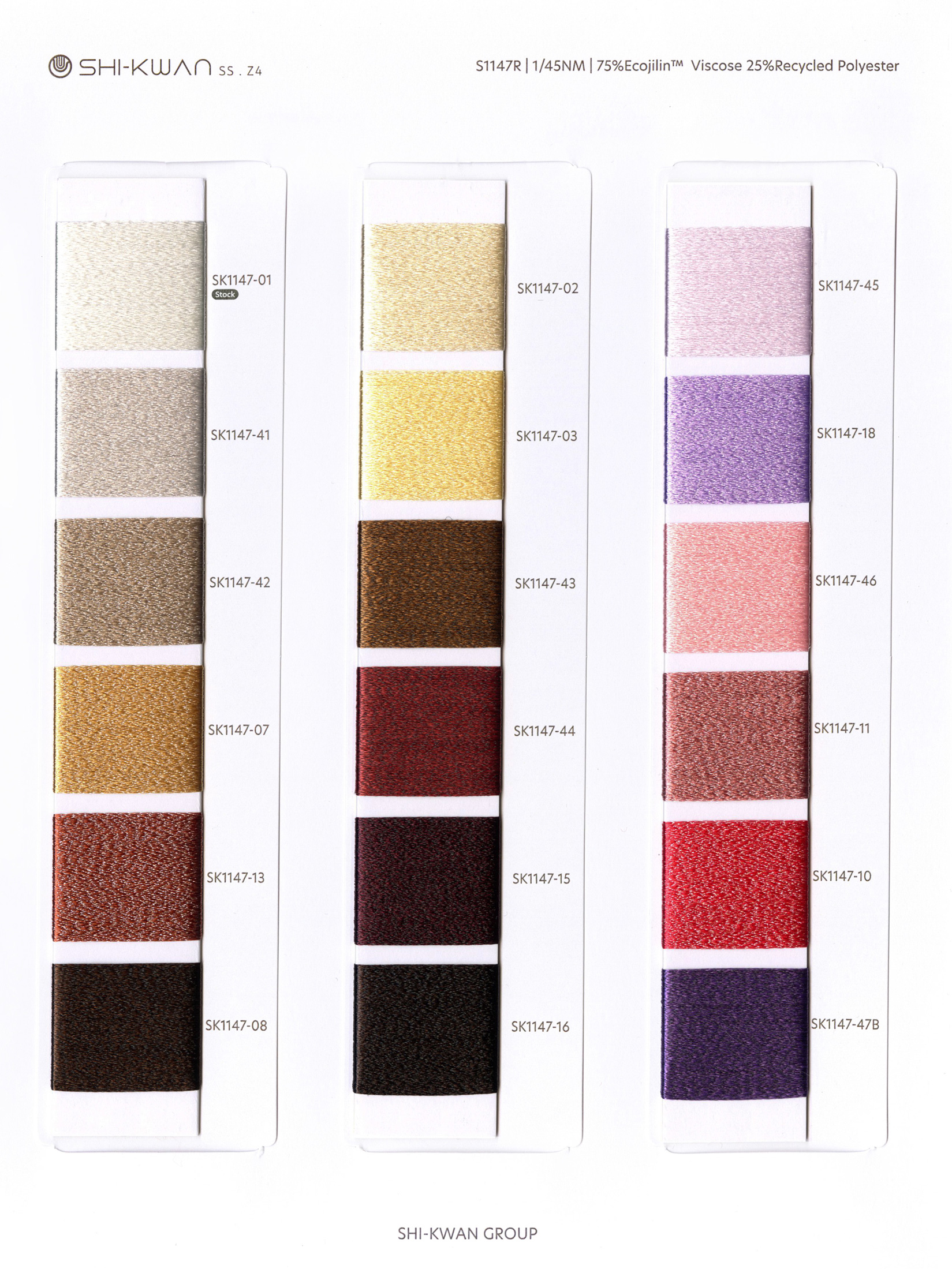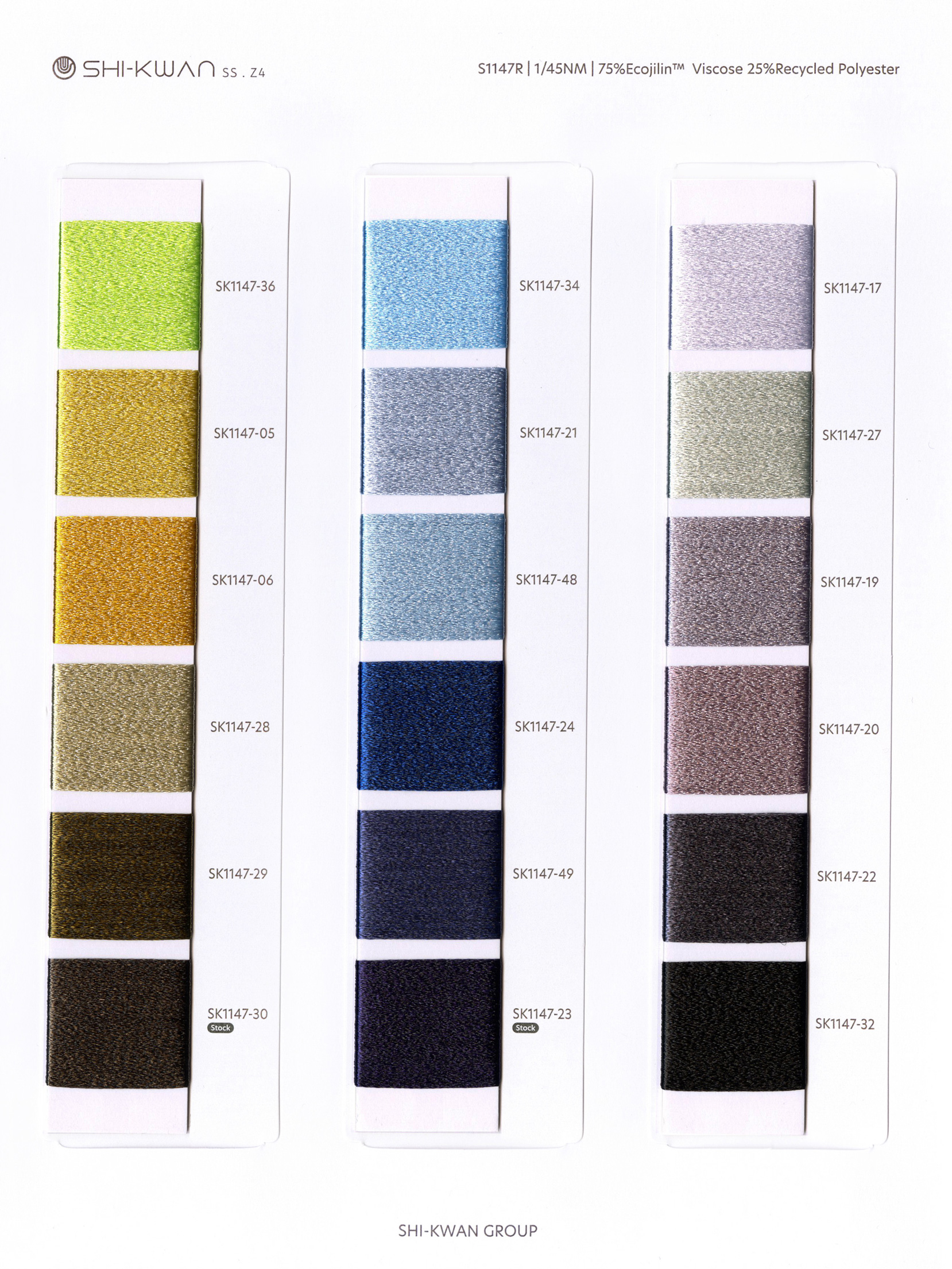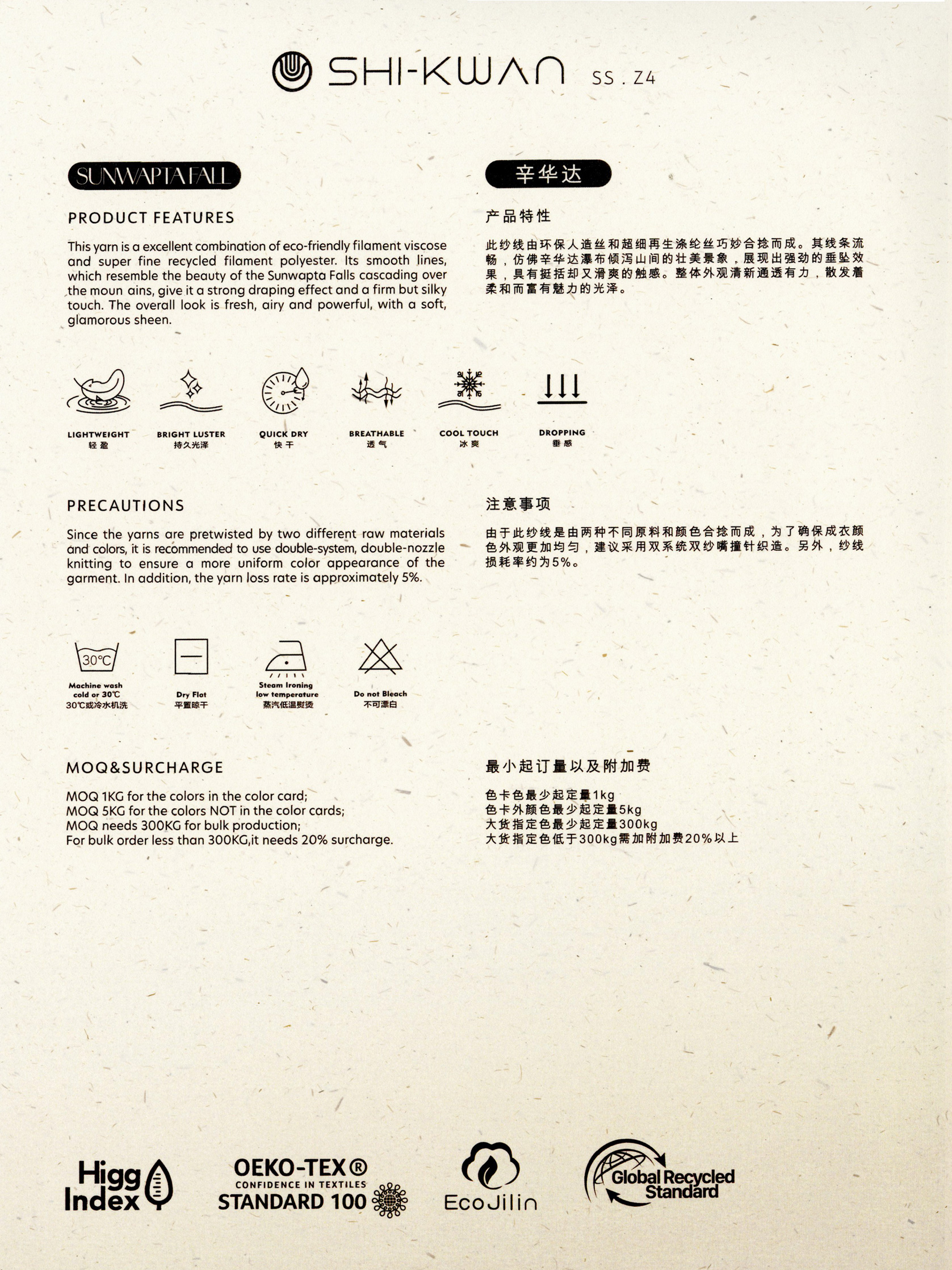 This yarn is a excellent combination of eco-friendly filament viscose and super fine recycled filament polyester. Its smooth lines, which resemble the beauty of the Sinvada Falls cascading over the mountains, give it a strong draping effect and a firm but silky touch. The overall look is fresh, airy and powerful, with a soft, glamorous sheen.
