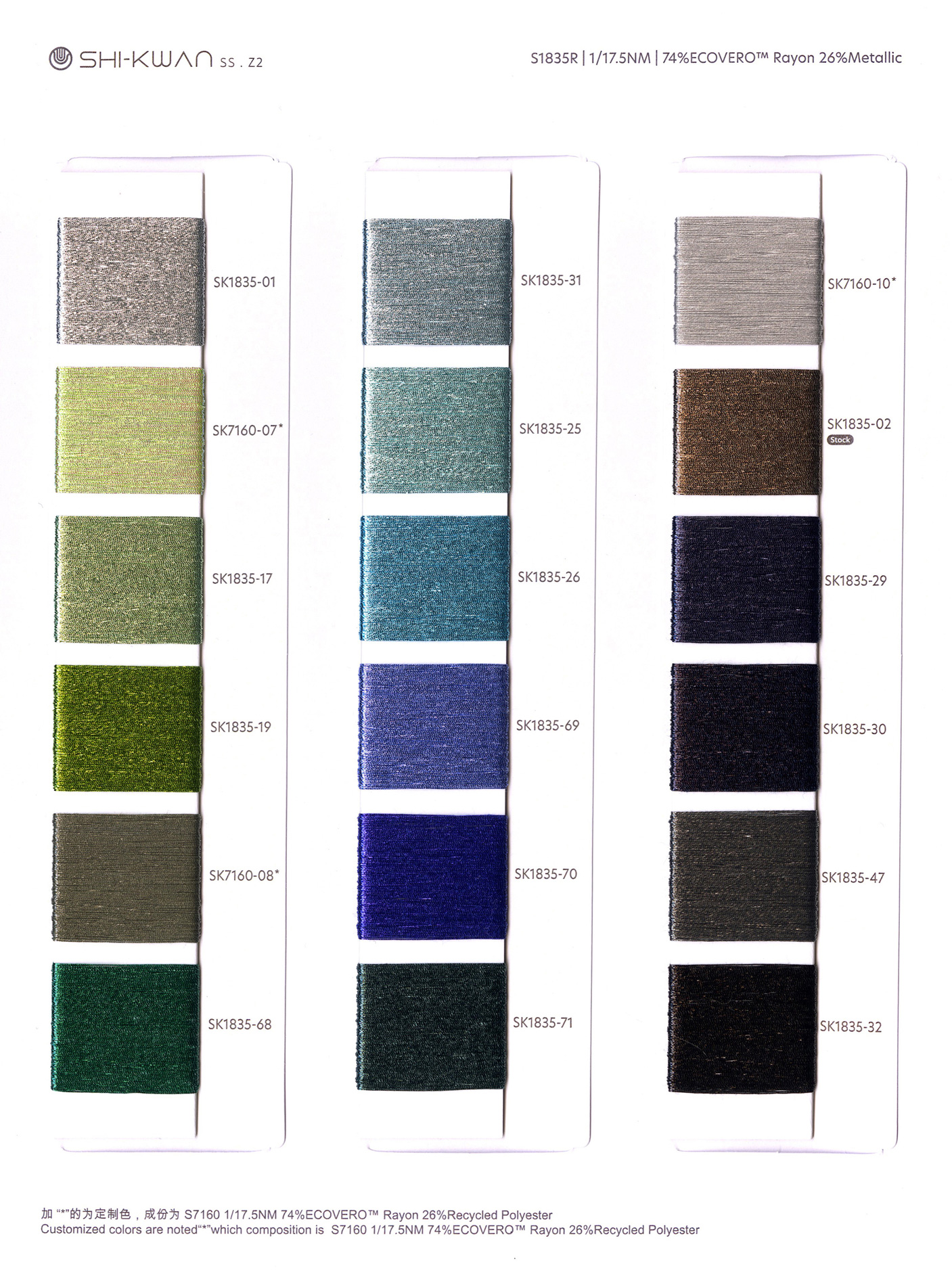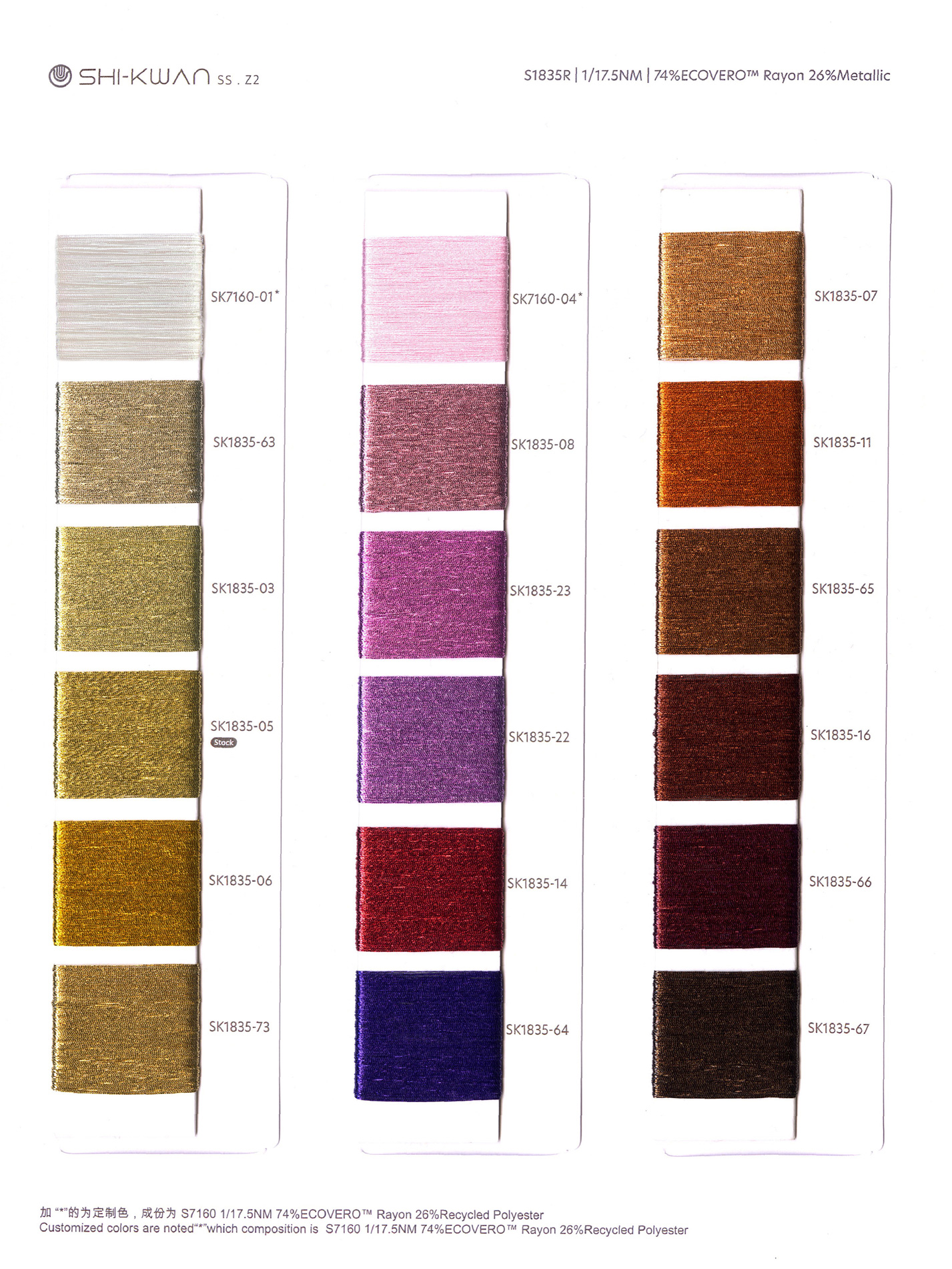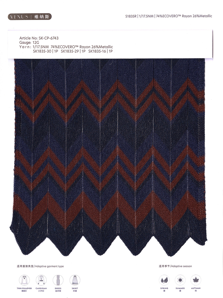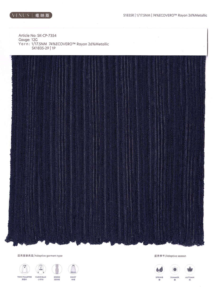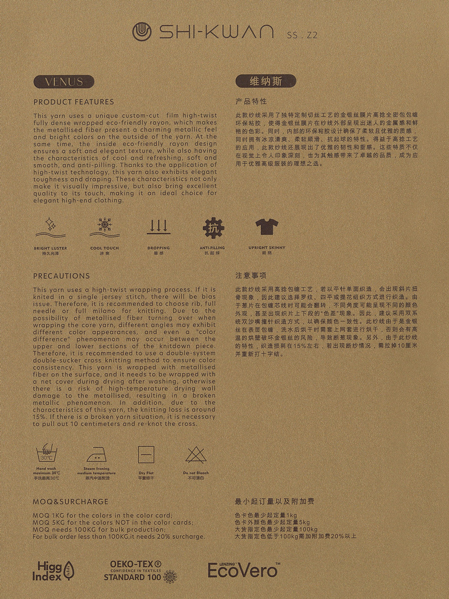 This yarn uses a unique custom-cut film high-twist fully dense wrapped eco-friendly rayon, which makes the metallised fiber present a charming metallic feel and bright colors on the outside of the yarn. At the same time, the inside eco-friendly rayon design ensures a soft and elegant texture, while also having the characteristics of cool and refreshing, soft and smooth, and anti-pilling. Thanks to the application of high-twist technology, this yarn also exhibits elegant toughness and draping. These characteristics not only make it visually impressive, but also bring excellent quality to its touch, making it an ideal choice for elegant high-end clothing.
